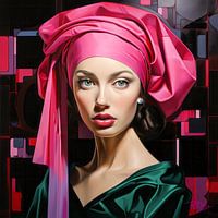 Rene van den Berg, bekend om zijn vermogen om klassieke kunst te herinterpreteren, presenteert een gedurfde, moderne kijk op "Meisje met de parel" van Vermeer. In dit digitale schilderij worden de traditionele kleuren vervangen door levendige tinten magenta, groen en roze. Het gezicht van het meisje is herkenbaar, omgeven door een wervelwind van abstracte vormen en patronen. De parel, ooit een subtiel detail, is nu nog steeds aanwezig, contrasterend met de groene tinten die het canvas domineren. Roze accenten geven warmte en diepte, waardoor het geheel een bijna neonachtige gloed krijgt. De achtergrond is een explosie van kleur, waarbij de grenzen tussen het meisje en haar omgeving vervagen. Van den Berg's creatie is een viering van de fusie tussen het oude en het nieuwe, waarbij hij de essentie van Vermeer's meesterwerk behoudt terwijl hij het naar het digitale tijdperk tilt.