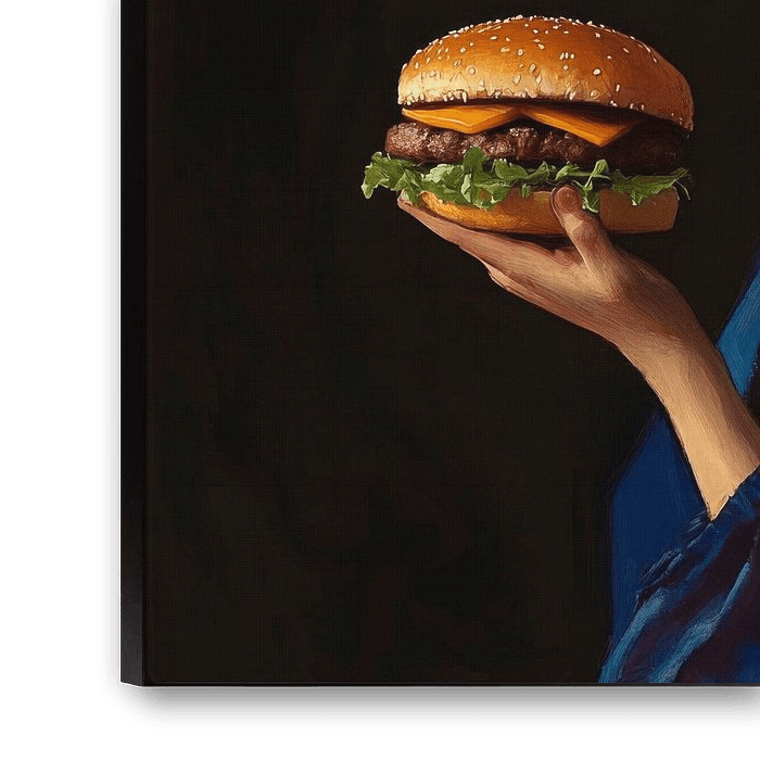 De afbeelding combineert klassieke schilderkunst met moderne elementen: Een meisje in traditionele kleding houdt een sappige hamburger vast terwijl ze een draadloze koptelefoon draagt. De contrasten tussen het historische gewaad en het hedendaagse fastfood creëren een fascinerende spanning en nodigen ons uit om na te denken over onze eetcultuur in het digitale tijdperk.