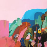 Modern kleurrijk abstract schilderij. Door vormen, lijnen en kleuren op een dusdanige manier met elkaar te combineren is er een soort landschapje ontstaan waarin iedereen weer iets anders ontdekt. Mooi in zowel groot als klein formaat, en mooi op ieder materiaal!