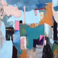 Modern kleurrijk abstract schilderij. Door vormen, lijnen en kleuren op een dusdanige manier met elkaar te combineren is er een soort landschapje ontstaan waarin iedereen weer iets anders ontdekt. Mooi in zowel groot als klein formaat, en mooi op ieder materiaal!
