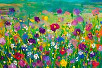 Abstract schilderij van een zomerse bloementuin in vrolijke kleuren.