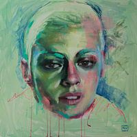 Een expressief portret dat de stilte van innerlijke reflectie voelbaar maakt. De intense blik, omlijst door een levendig palet van mintgroen, turquoise en roze, roept een sfeer op van mysterie en introspectie. De gelaagdheid in kleur en penseelstreek geeft dit werk een bijna dromerige, spirituele uitstraling.
