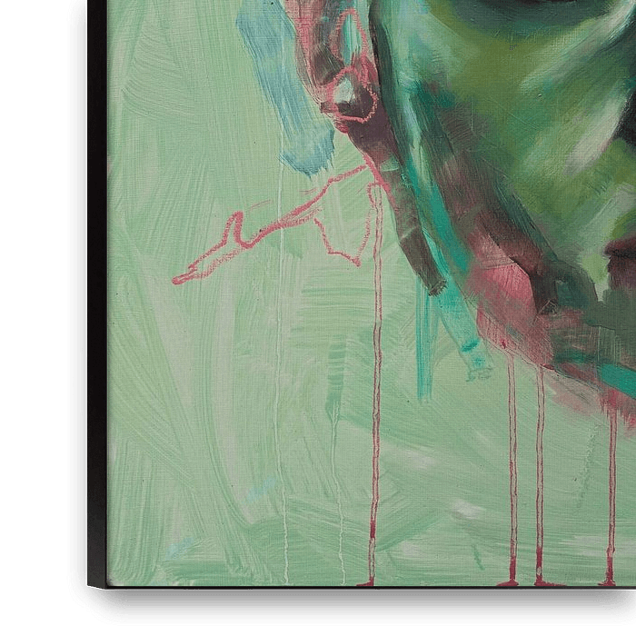 Een expressief portret dat de stilte van innerlijke reflectie voelbaar maakt. De intense blik, omlijst door een levendig palet van mintgroen, turquoise en roze, roept een sfeer op van mysterie en introspectie. De gelaagdheid in kleur en penseelstreek geeft dit werk een bijna dromerige, spirituele uitstraling.