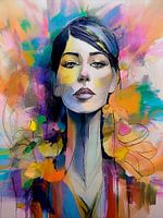 Een modern abstract portret van een vrouw met kleurrijke bloemmotieven in aquarel effect.