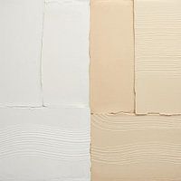 Een kunst werk van zacht wit en beige zand kalk blokken vormen te samen een geheel modern abstract in 3D.
