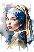 Modern "meisje met de parel" in aquarel. Collectie: nieuwe meesters (portret geïnspireerd op de "oude meesters", in dit geval Johannes Vermeer.