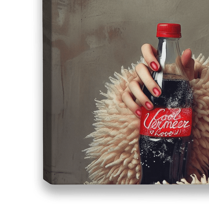 Het kunstwerk, getiteld "Vermeer's Verfrissing", toont een jonge vrouw met een serene uitdrukking, gekleed in een zachte, textuur rijke jas met een pastel blauwe hoofddoek. Haar houding is ontspannen en de parel oorbel, een knipoog naar Vermeer's bekende "Meisje met de Parel", voegt een klassieke elegantie toe. Ze houdt een fictieve…