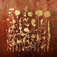 Koop dit bloemen kunstwerk Modern mixed media schilderij. Droogbloemen in goud. Serie: Botanische kunst van Studio Pieternel als print op canvas, aluminium dibond, (ingelijste) fotoprint, behang en ArtFrame. Voor jou op maat geprint in Fine-Art kwaliteit.