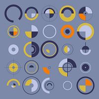 Dit werk toont een 5x5 opstelling van 25 geometrische cirkels, elk met zijn eigen patroon en individuele kleurcompositie. Het kleurenpalet bevat blauw-, geel-, oranje- en grijstinten. Sommige cirkels zijn verdeeld in segmenten, andere bestaan uit concentrische ringen of overlappende lijnen. Ondanks de uniforme basisvorm creëert de verscheidenheid aan patronen een levendige visuele dynamiek.