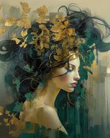 Modern portret van een jonge vrouw in verschillende groentinten gecombineerd met goud met de titel "Botanical Brilliance". Als je goed kijkt ontdek je botanische elementen (takjes, blaadjes, etc) in dit werk. Een bijzonder en uniek portret voor aan je muur!