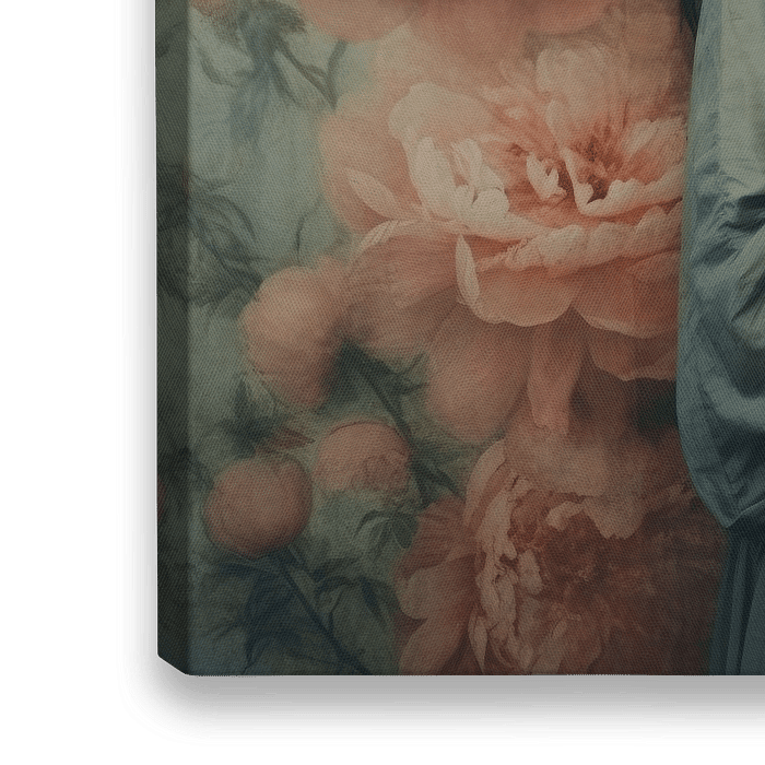 Modern portret "Pioenrozen". Een donkerharige vrouw met lang haar staat voor een achtergrond vol pioenrozen, ook heeft ze pioenrozen in haar hand. Een bijzonder en uniek werk in pastelkleuren.