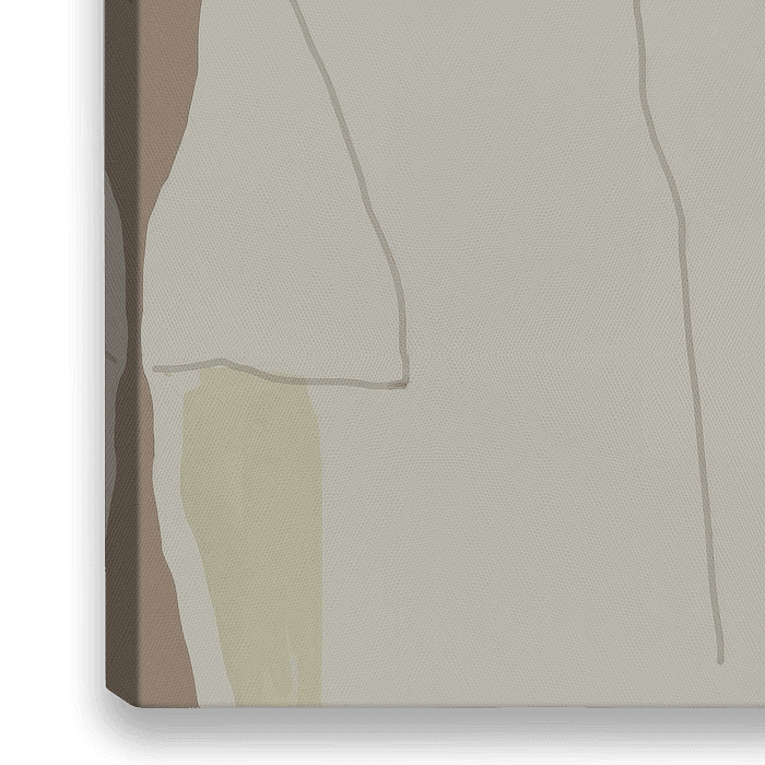 Modern en abstract portret van een donkerharige vrouw met de titel "rust" in zachte neutrale kleurtinten. De vrouw laat haar hoofd op haar schouder rusten. Op groot formaat is dit echt een statement aan je muur!