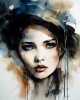 Modern portret van een jonge vrouw in aquarel (waterverf). Het gebruikte kleurenpalet geeft contrast aan dit werk, waardoor de kleuren van je muur af spatten!