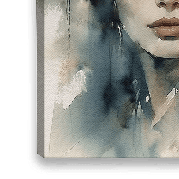 Modern portret van een jonge vrouw in aquarel (waterverf). Het gebruikte kleurenpalet is ingetogen, maar geeft toch het nodige contrast aan dit werk, waardoor het een echt statement aan je muur zal zijn!