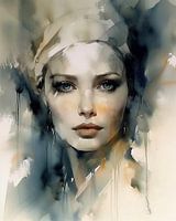 Modern portret van een jonge vrouw in aquarel (waterverf). Het gebruikte kleurenpalet is ingetogen, maar geeft toch het nodige contrast aan dit werk, waardoor het een echt statement aan je muur zal zijn!