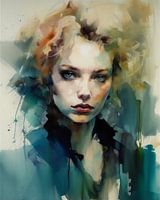 Modern portret van een jonge vrouw in aquarel (waterverf). Het gebruikte kleurenpalet geeft contrast aan dit werk, waardoor de kleuren van je muur af spatten!