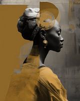 Modern portret in collage stijl, goudbruin. Portret met een chique uitstraling, deels abstract. Dit is een echte blikvanger voor je wand. Kies zelf het formaat en materiaal bij dit werk.