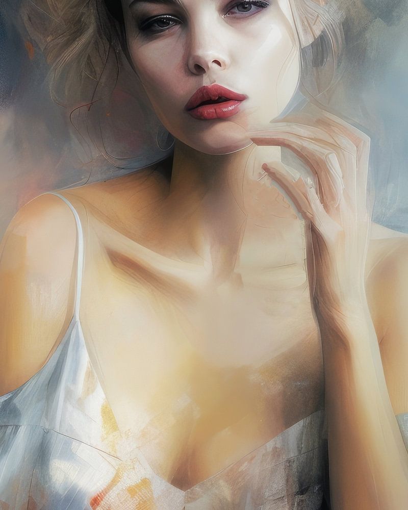 Modern portret in een zachte sfeer van een blonde vrouw in een prachtige jurk. De lichte en donkere tinten contrasteren met elkaar.