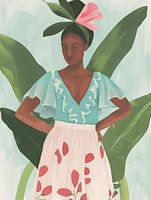 Modern portret in pastelkleuren, illustratie. Een jonge vrouw staat voor grote bladeren, dit werk heeft een tropisch tintje. Een bijzondere blikvanger!