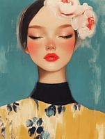 Modern portret in pastelkleuren van een jonge vrouw met gesloten ogen en bloemen in het haar. Een bijzondere blikvanger voor je interieur! Kies zelf het formaat en materiaal bij dit werk en maak het helemaal naar wens.