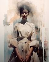 Modern portret in pasteltinten. Een jonge vrouw, gecombineerd met een abstracte achtergrond, mixed media.