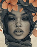 Modern portret van een jonge Afrikaanse vrouw met sproeten in sepia en oranje. Een bijzondere blikvanger! Kies zelf het formaat en materiaal bij dit werk en maak het helemaal passend voor jouw interieur.