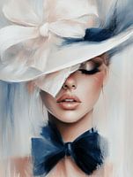 Modern portret in wit en blauw, de dame met de hoed. Een bijzondere blikvanger voor je interieur! Kies zelf het formaat en materiaal bij dit werk en maak het helemaal naar wens.