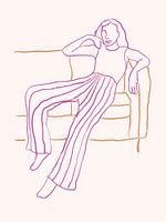 Moderne illustratie: portret van een zittende vrouw, lijntekening. Woonstijl modern en bohemian in mosterdgeel en roze paars.