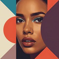 Een modern gezicht gemaakt van gebogen en geometrische kleurvormen. De combinatie van realisme en graphics geeft het motief diepte.