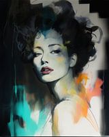 Modern portret met een nostalgisch tintje van een jonge vrouw in zwart en wit met een vleugje groen/blauw, geel en oranje.
