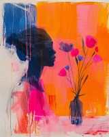 Een modern abstract schilderij dat een vrouw en een vaas met bloemen als centrale motieven heeft. De afbeelding vertoont een symbiotische relatie tussen de vrouwelijke figuur en de bloemen, die krachtige symbolen zijn van schoonheid, liefde en vernieuwing. De kleuren en vormen creëren een dynamisch spel van abstractie, waardoor de kijker wordt uitgenodigd om de diepere betekenis van het kunstwerk te verkennen.