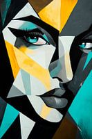 Intense ogen, ondergedompeld in een fascinerend samenspel van geometrische vormen en levendige kleuren, trekken de kijker op magische wijze aan. De combinatie van felgeel en diepzwart geeft het werk een moderne elegantie. Ideaal voor een stijlvolle woonkamer, waar het een gesprek stimuleert en een vleugje creativiteit toevoegt.
