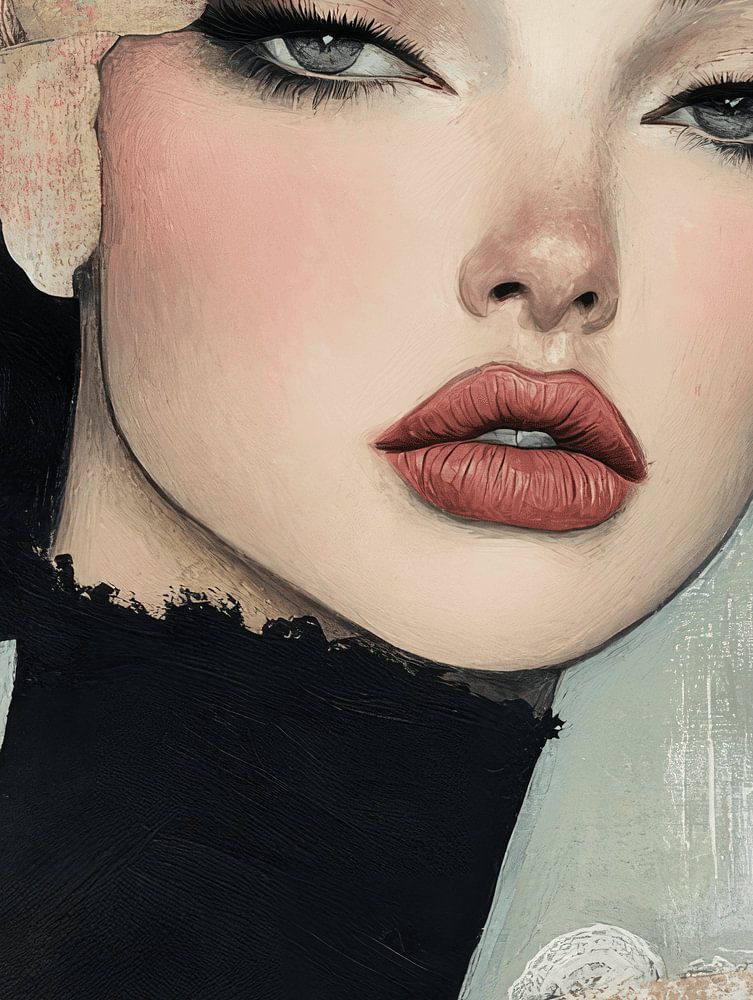 Dit kunstwerk toont een vrouw met een zelfverzekerde en sensuele uitstraling. Haar gezicht wordt geaccentueerd door een grote bloem die elegant achter haar oor is geplaatst, en haar donkere, glanzende haar is strak naar achteren gestyled. Haar blik is intens, met scherpe contouren en volle lippen die de aandacht trekken. Ze draagt een donkere, hoge kraag met delicate kantdetails, wat een vleugje klassieke verfijning toevoegt aan haar moderne, krachtige voorkomen.