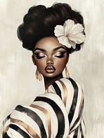 Modern portret van een jonge vrouw met grote bloem in het haar en gestreepte kleding met gouden accenten. Een bijzondere blikvanger voor je interieur! Kies zelf het formaat en materiaal bij dit werk en maak het helemaal naar wens.