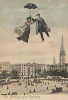 Man en vrouw met aktetas en drie baby's boven Hamburg, P. Michaelis Een van de eerste fotomanipulaties, uit het begin van de 20e eeuw's.