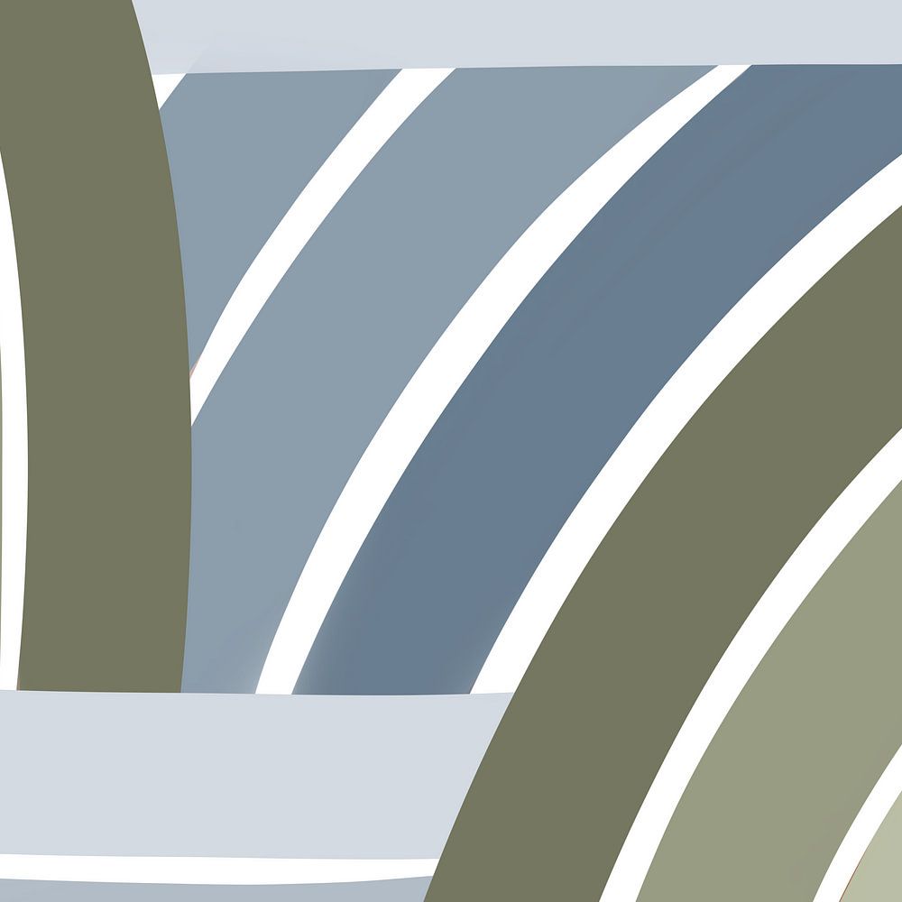 Dit schilderij is een moderne twist op de jaren 1970. Met verschillende blauwe en groene banen, van pastel tot donker groen en blauw.