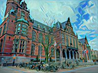Haal kunst van Groningen in huis met dit moderne schilderij van het Academiegebouw. Met behulp van kunstmatige intelligentie is dit schilderij gegenereerd op basis van de kunststijl Futurisme. Het resultaat is een strakke doch herkenbare compositie met aansprekende frisse kleuren. Dit schilderij van Slimme Kunst komt inclusief herinneringen van lange studeersessies in de Universiteitsbibliotheek met uitzicht op dit monumentale Groningse gebouw!