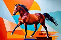 Een levendig en modern schilderij van een krachtig paard in beweging, omlijst door abstracte vormen en stralende kleuren. De dynamische compositie, met heldere tinten van oranje, blauw en wit, brengt energie in elke ruimte. Perfect voor liefhebbers van dierenkunst en eigentijdse stijlen. Een echte blikvanger!