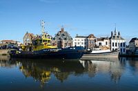 Modern patrouillevaartuig van de Port of Rotterdam naast de oudste stoomslepervan Nederland, de ss Furie in Maassluis.