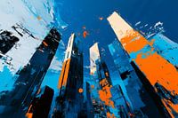 Een krachtig samenspel van fel oranje en diep blauw ontvouwt zich als moderne wolkenkrabbers de lucht in vliegen en een levendige skyline van een stad schetsen. Deze dynamische compositie straalt energie en creativiteit uit en is perfect voor een kantoor om inspiratie en moderne charme te bevorderen.