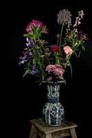 Foto van een boeket bloemen in een vaas op een houten krukje