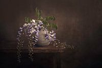 Modern stilleven blauwe regen als oude meesters met natuurlijk licht via raam.