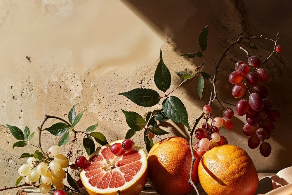 Modern stilleven met harde schaduwen. Helemaal van nu! Een stilleven op een zomerse dag, waan je op vakantie met dit zonnige kunstwerk van fruit in terracotta tinten.