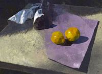 Ik kocht op de markt twee kweeperen en twee mooie artisjoc takken die in paars papier verpakt werden. Thuis legde ik het gescheurde papier en de peren even op de tuintafel in de zon. En voila, mooier kon het eigenlijk niet. Geel en paars zijn complementaire kleuren. En het wit van de binnenzijde van het papier, prachtig.