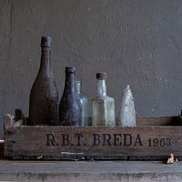 Een modern stilleven van stoffige flesjes in een krat van de RBT Breda (Groentenveiling)