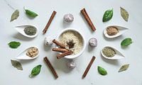 Verfijnd stilleven met mooie vormen en kleuren op porseleinen ondergrond met marmer structuur .Brengt een kunstzinnige frisse sfeer in uw kamer.