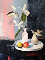 Modern stilleven van bloemen en fruit in pastelkleuren met contrasterend zwart. Een bijzondere blikvanger voor je interieur! Kies zelf het formaat en materiaal bij dit werk.