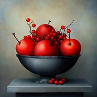 Een hyperrealistische fruitschaal vol levendige, rijpe vruchten in intense, briljante kleuren die van het doek afspatten. Dit moderne stilleven toont een harmonieus samenspel van knalrode appels en bessen waarbij elk stuk fruit schittert in zijn natuurlijke glans. Het licht valt perfect op de vruchten, waardoor de details van hun texturen en sappigheid bijna tastbaar zijn.
