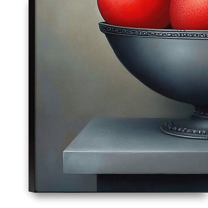 Een hyperrealistische fruitschaal vol levendige, rijpe vruchten in intense, briljante kleuren die van het doek afspatten. Dit moderne stilleven toont een harmonieus samenspel van knalrode appels en bessen waarbij elk stuk fruit schittert in zijn natuurlijke glans. Het licht valt perfect op de vruchten, waardoor de details van hun…