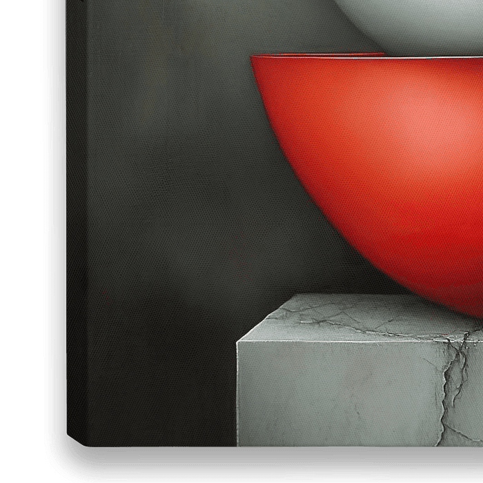 Een minimalistisch, modern stilleven voor met drie zorgvuldig op elkaar gestapelde schalen in verschillende tinten: warm rood onderaan, zacht beige in het midden en koel grijs bovenop. Deze schalen hebben strakke lijnen en een matte afwerking, waardoor ze zowel eigentijds als tijdloos ogen. De compositie is eenvoudig maar krachtig en…